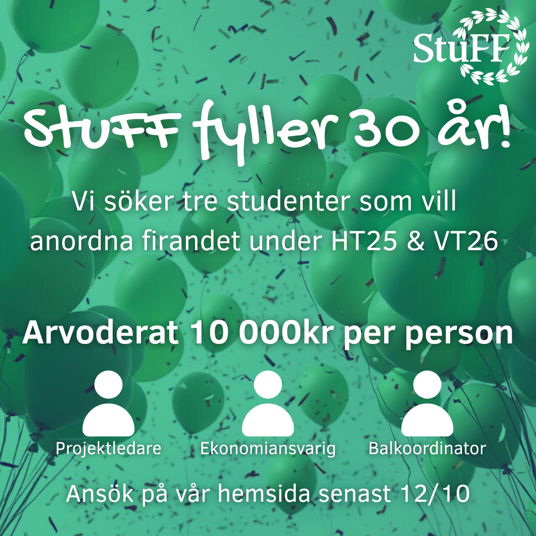 StuFF fyller 30 år under 2026 och Kårstyrelsen har påbörjat planeringen av ett jubileumsfirande. Med oss i arbetet önskar vi tre studenter som vill jobba deltid som antingen projektledare, ekonomiansvarig eller balkoordinator. Arbetet är arvoderat, 10,000 kr/person, och kommer att pågå från 1 november 2025 - 1 juni 2026. Arbetet kommer självklart kunna kombineras med dina studier. Förutom en storslagen bal under vårterminen på Konsert & Kongress tänker vi oss att projektgruppen kommer med egna idéer på roliga evenemang både innan och efter. Detta kan vara allt ifrån dagsaktiviteter till roliga tävlingar. Låter detta intressant? **Maila din ansökan till vke@stuff.liu.se senast 12 oktober. **